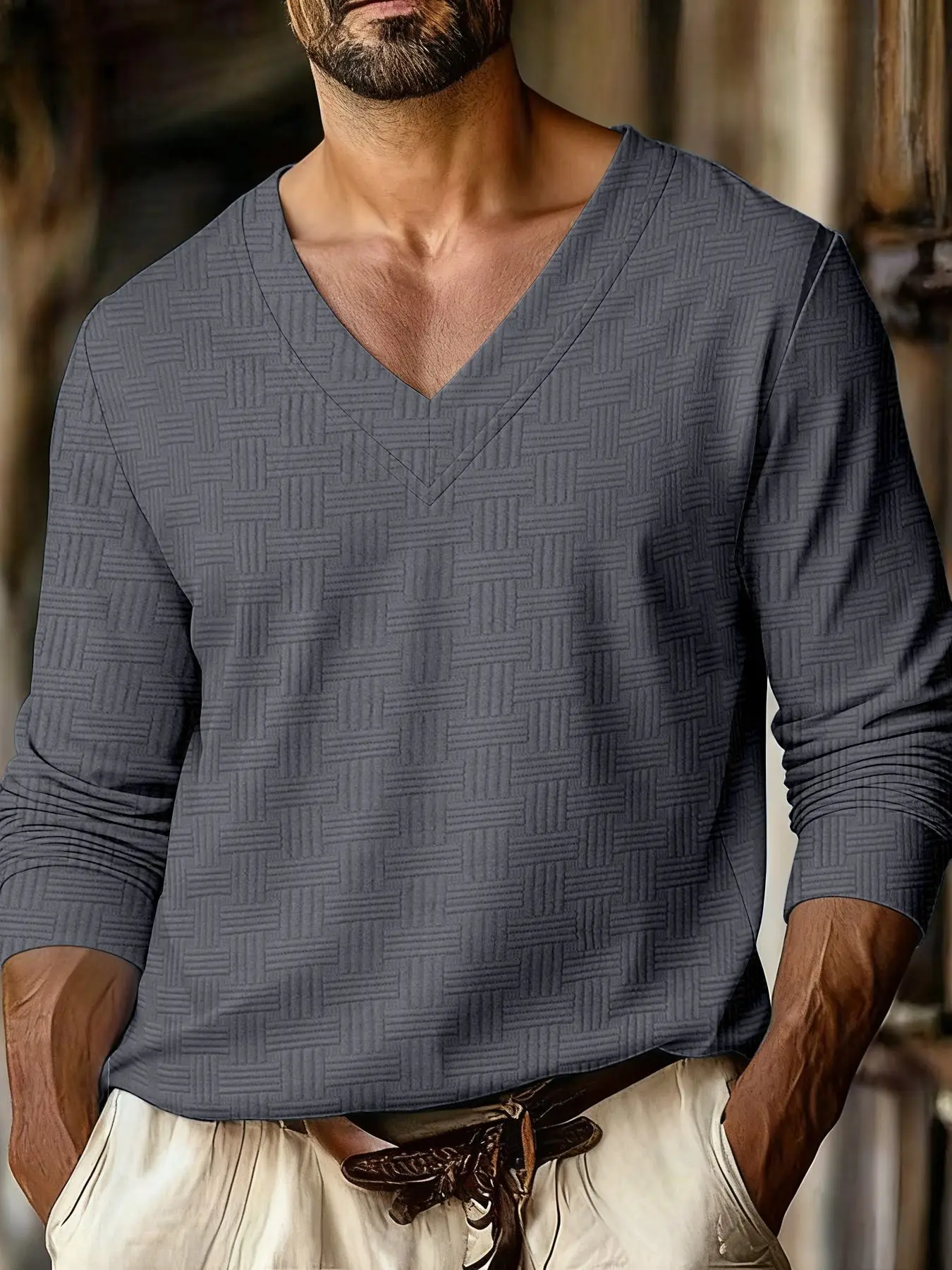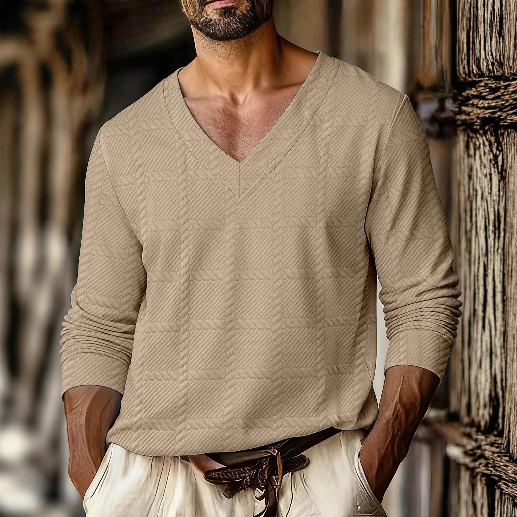 Autumn New Men's Plaid Pattern Jacquard Fabric V-neck Casual Sports Off-shoulder Sleeve Long-sleeved T-shirt