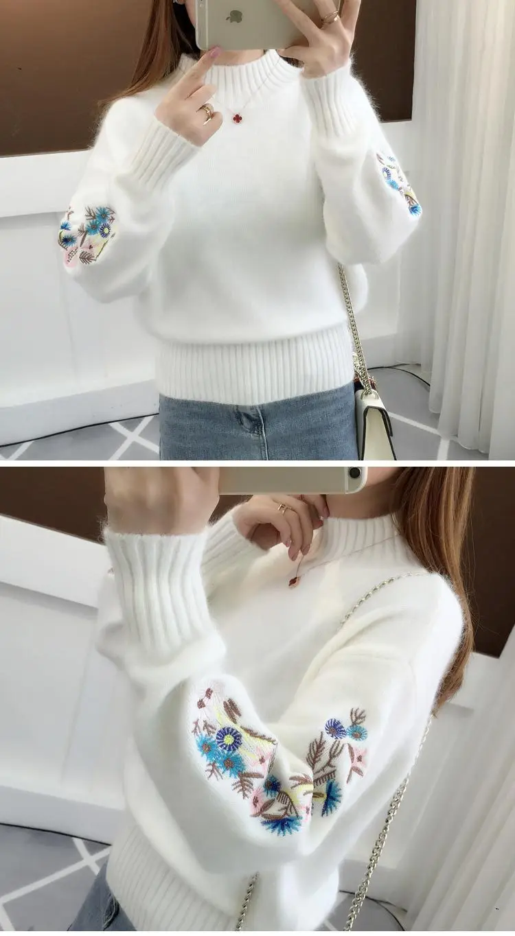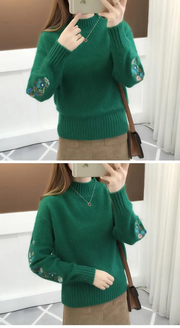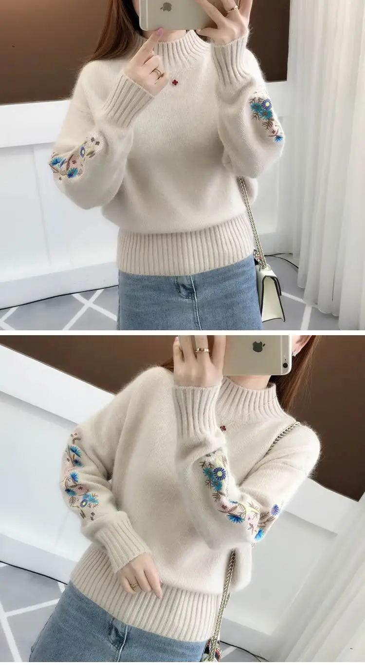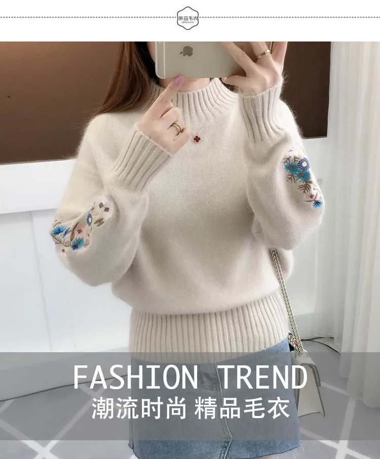 Women's Autumn Winter Embroidered Sleeves with Long Sleeves Knit Pullover Women Clothing Vintage Half High Collar Loose Sweaters