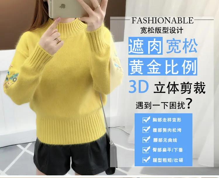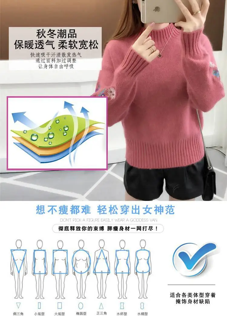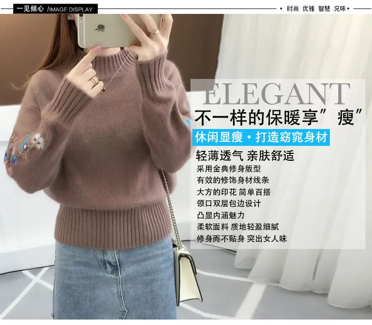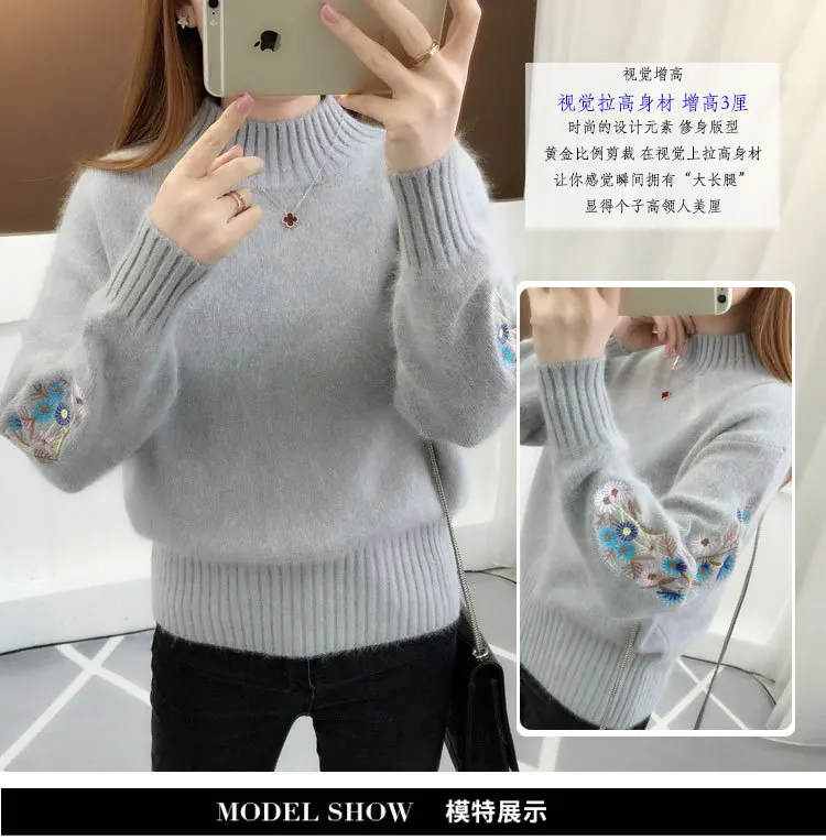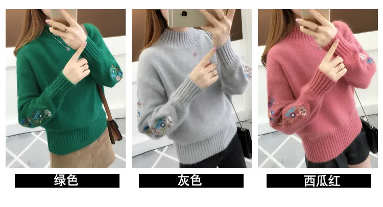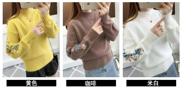 Women's Autumn Winter Embroidered Sleeves with Long Sleeves Knit Pullover Women Clothing Vintage Half High Collar Loose Sweaters
